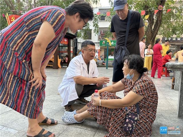 “医生,医生,快过来,这里有人晕倒了!”当天下午5时许,在义诊活动现场突然有人大声呼救,原本有序的义诊现场一时间慌乱起来,只见义诊现场旁边有一位老年妇女瘫倒在地,患者满头大汗,嘴唇苍白,情况十分紧急,在现场参加义诊的三亚长城医院外科专家候文斌、心内科专家郭贞山立刻蹲下对老年妇女展开救助。经检查发现,老年妇女并未完全失去意识,便尝试与患者进行沟通,询问其病史等情况,最后得知该妇女因贫血而晕倒。在医生的指导下,街心公园党群服务站工作人员将人群疏散开,为该妇女保持一定的空间,让空气流通,并为晕倒的老年妇女撑伞遮荫。